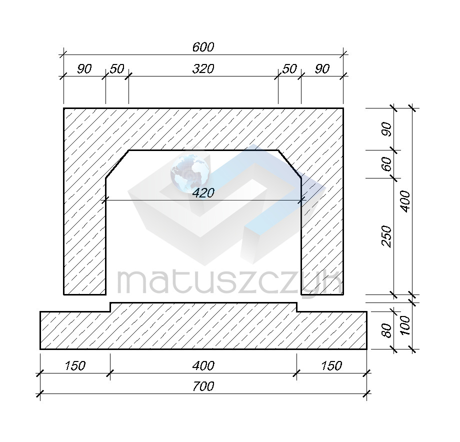 Pokrywa łupinowa wykonana z betonu klasy C35/45. Składa się z pokrywy o długości 0,8 m oraz fundamentu o długości 1 m. Ciężar kompletu 600 kg + 2 x 145 kg.