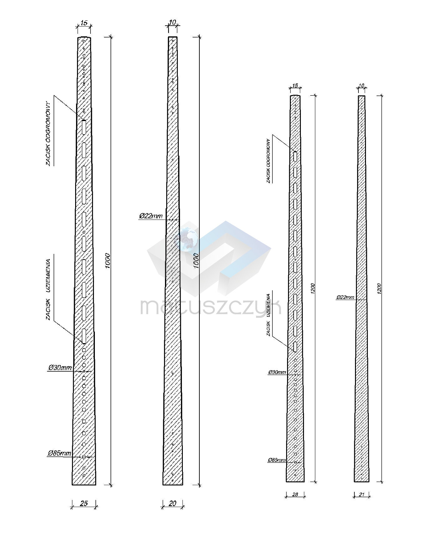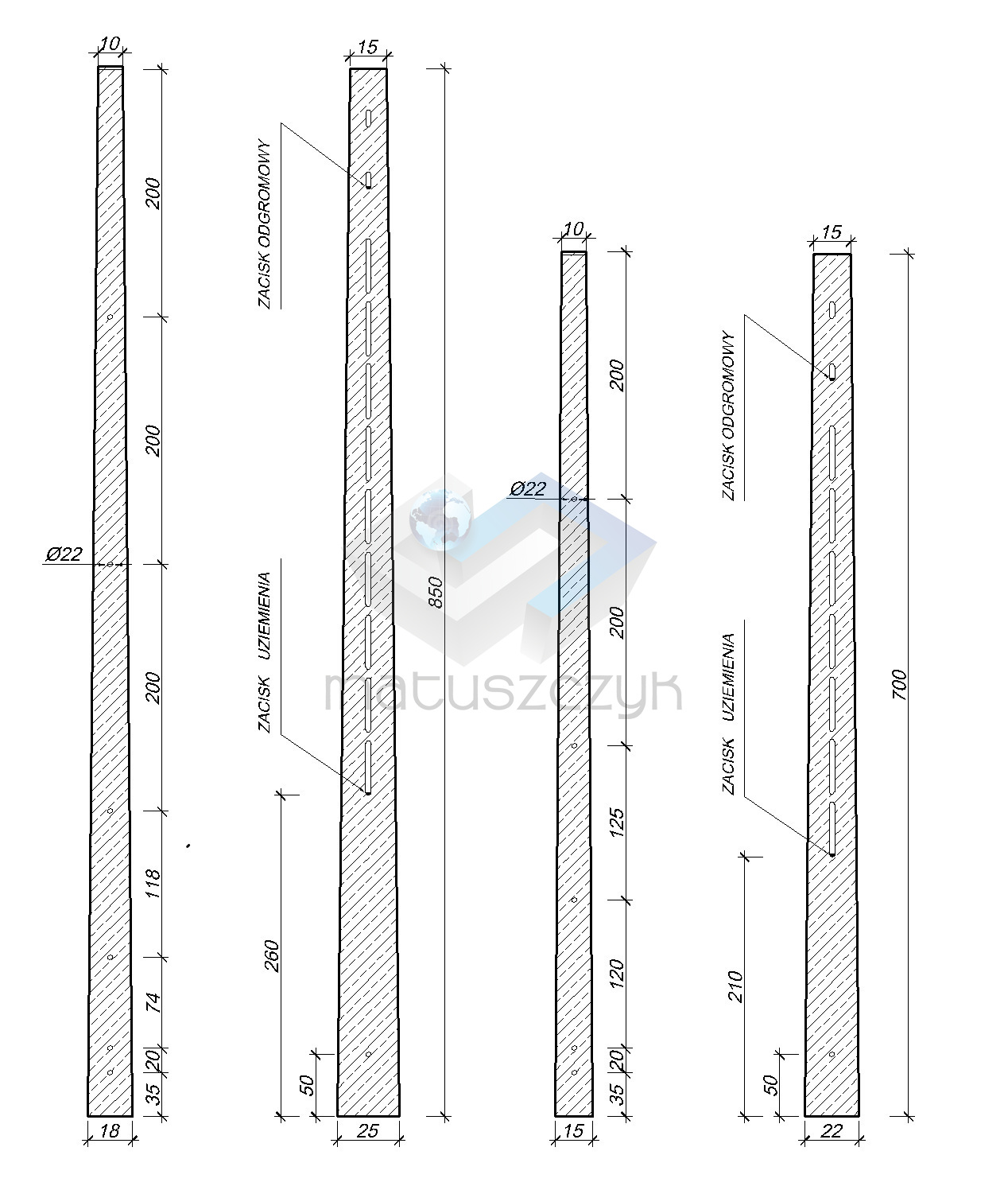 Słupy wykonane z betonu klasy co najmniej C30/37. Długość odpowiednio 7 m i 8,5 m. Ciężar: słupa SŻT-7 – 340 kg, słupa SŻT-8,5 – 520 kg.