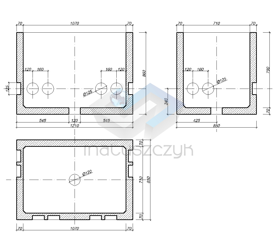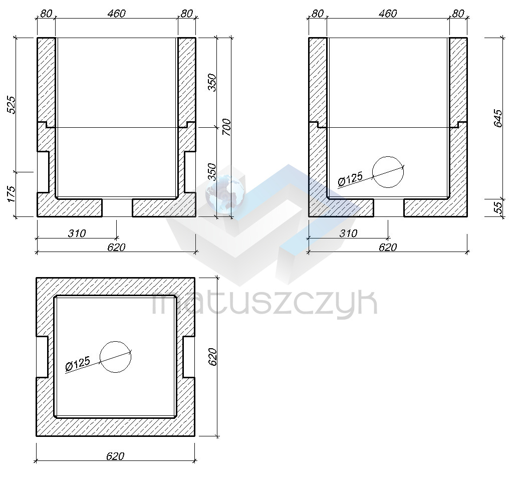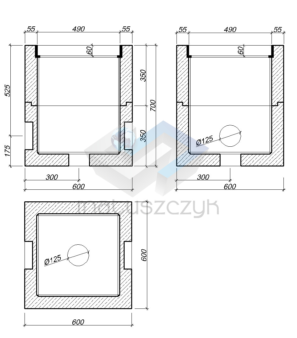 Korpus studni jest 2-częściowy wykonany z betonu klasy co najmniej C30/37. W górnej części znajduje się wbetonowana rama żeliwna z pokrywą lekką. W dolnej części znajdują się otwory Ø125 mm w dwóch przeciwległych ścianach. W dnie studni jest otwór odsączający Ø125 mm. Ciężar studni 235 kg.