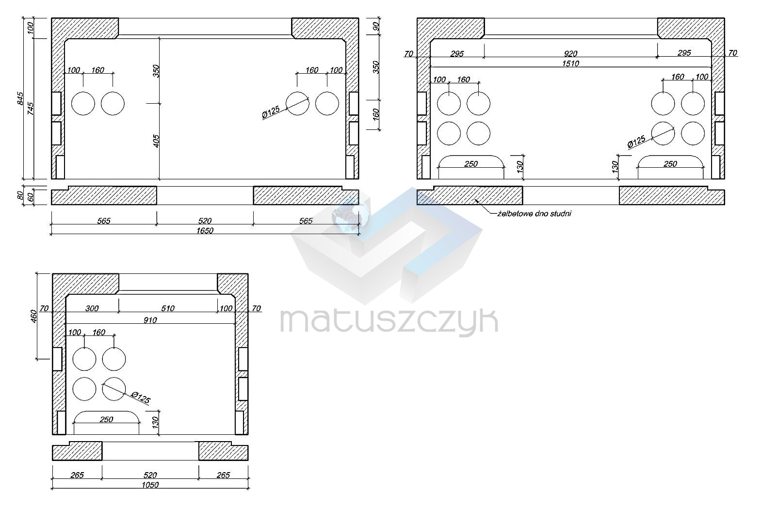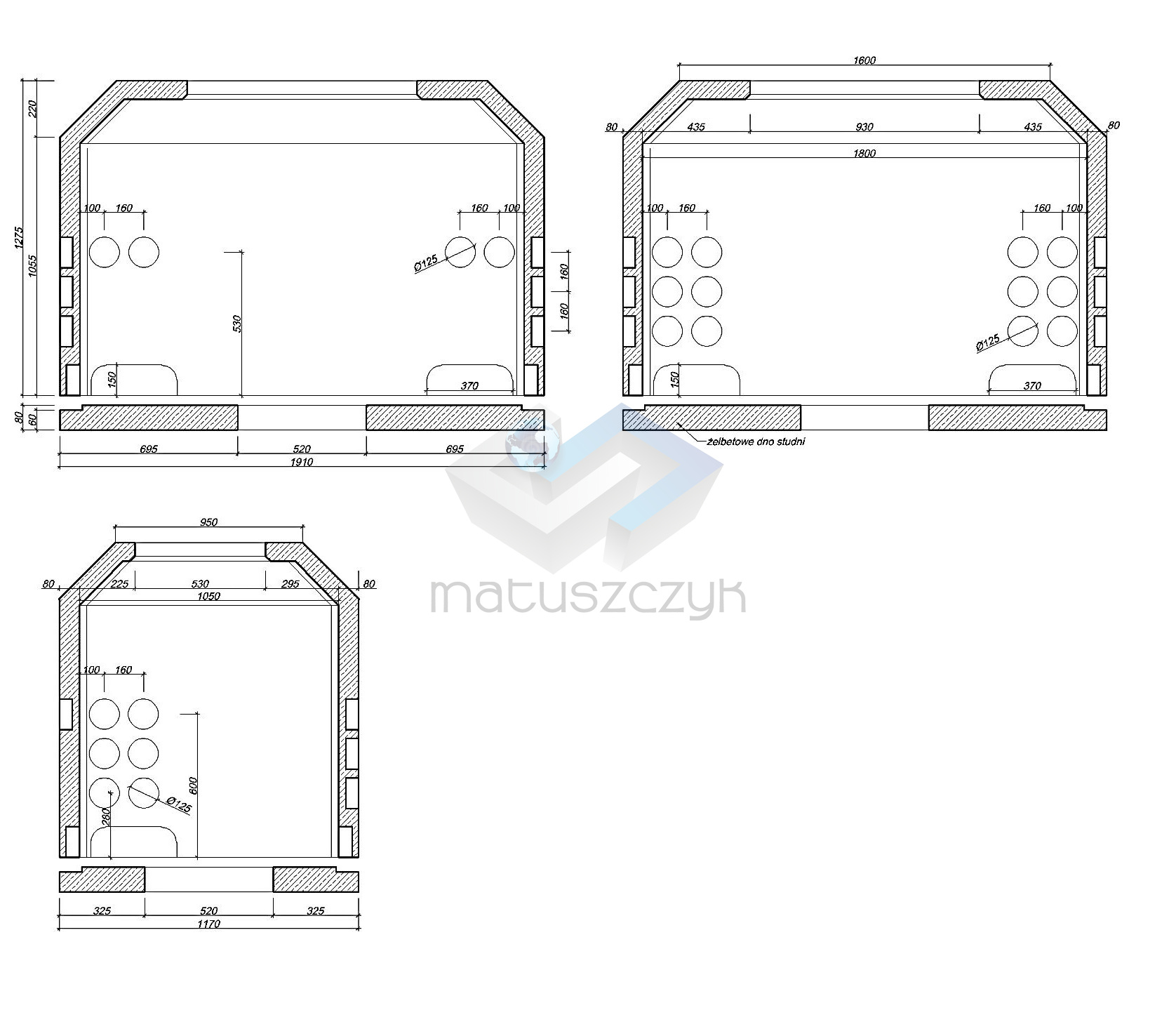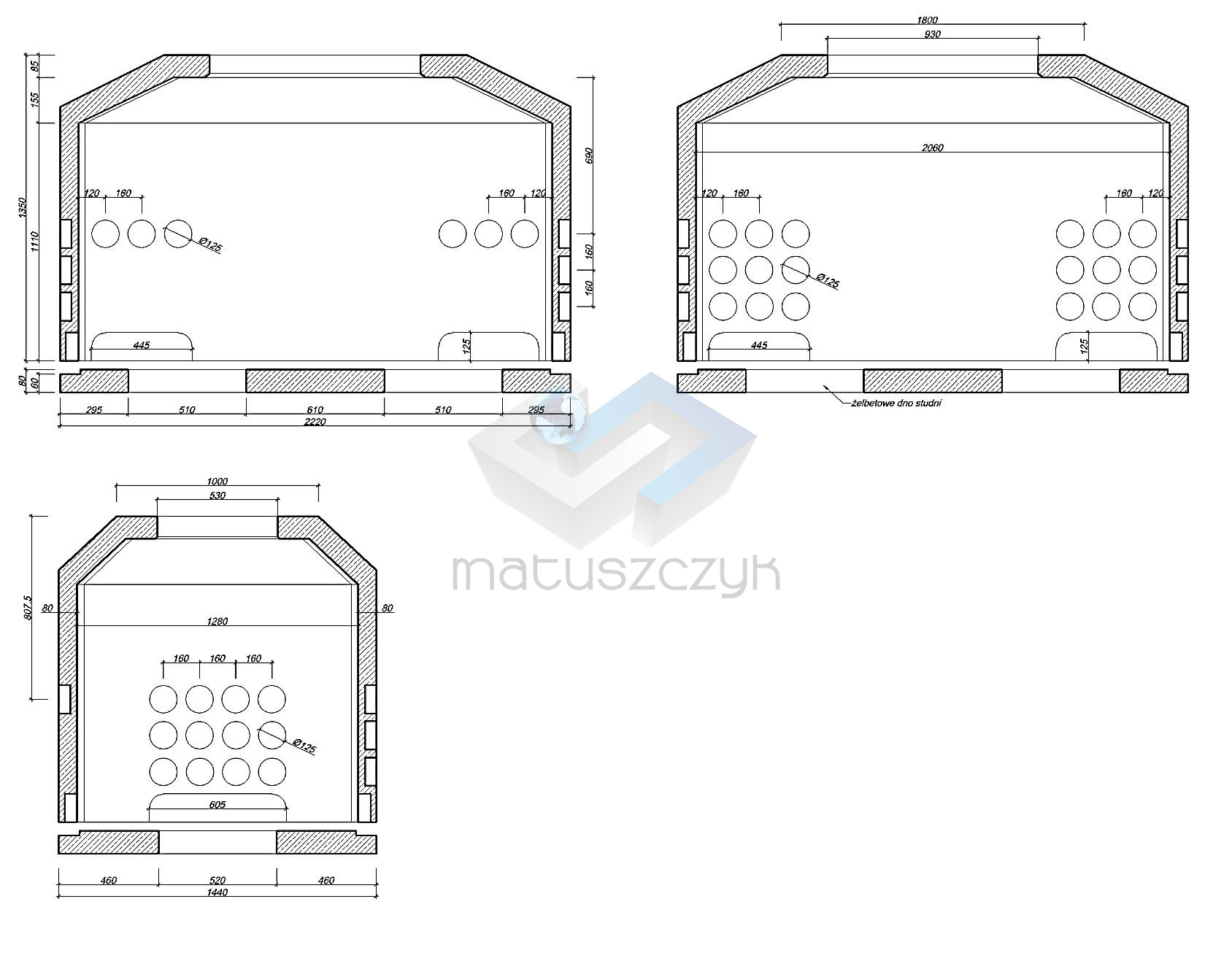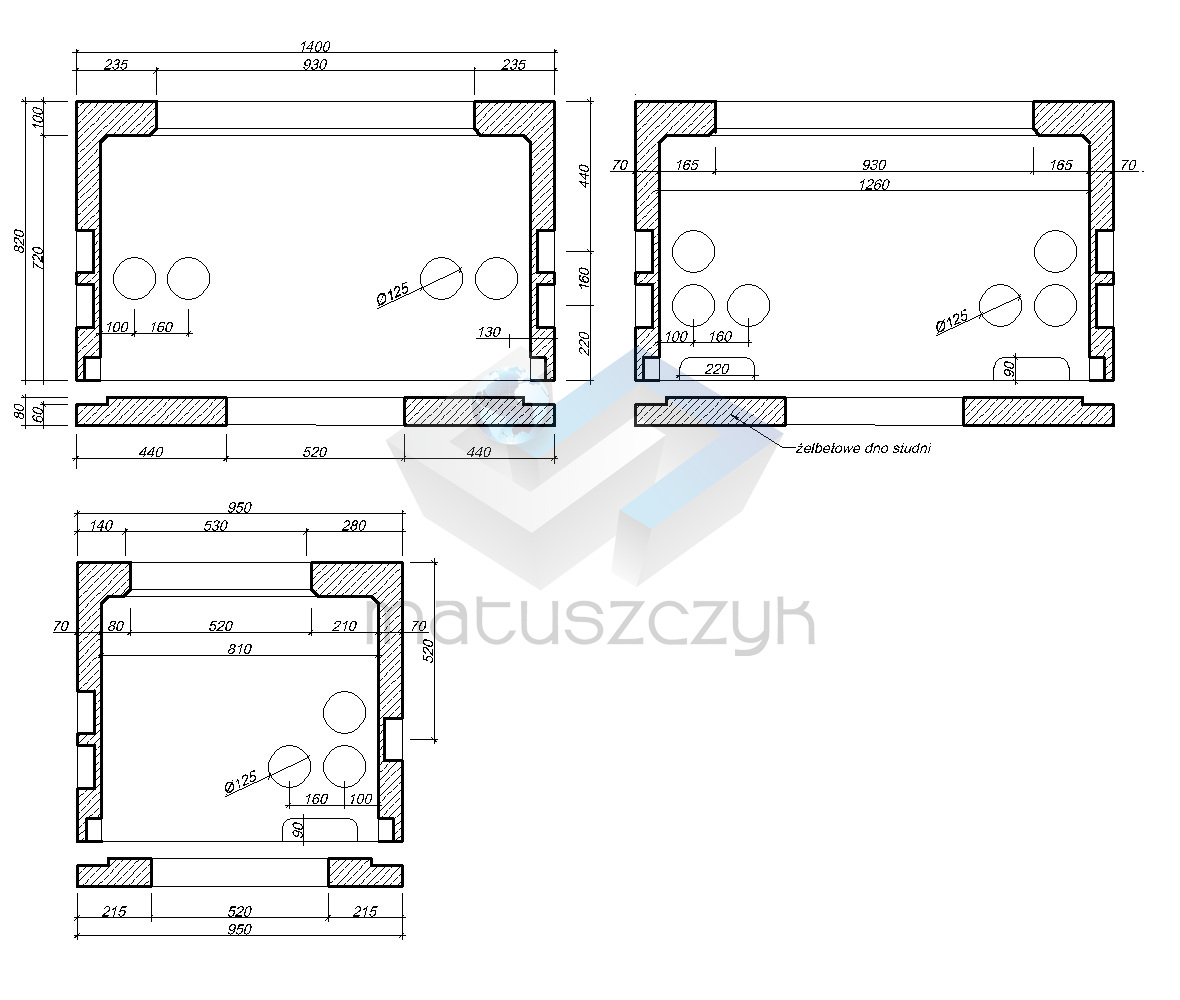 Korpus studni jest 1-częściowy wykonany z betonu klasy co najmniej C30/37. Studnia wyposażona jest w zwieńczenie składające się z ramy lekkiej osadzonej w żelbetowym wieńcu oraz pokrywy lekkiej z wietrznikiem lub bez. W dnie studni znajduje się otwór odsączający. Ciężar studni 500 kg.