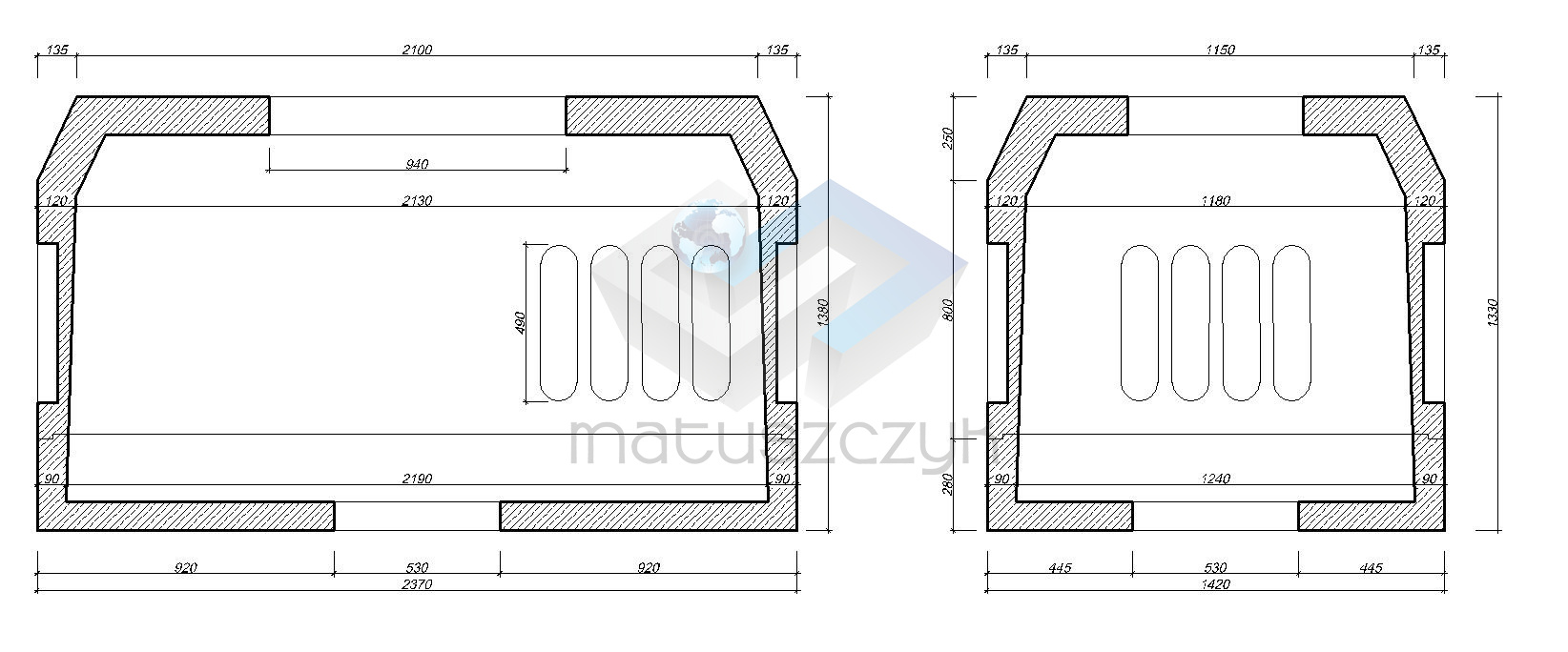 Do budowy telekomunikacyjnej kanalizacji kablowej 2-otworowej dla rur Ø110 mm jako studnia optymalna przelotowa, odgałęźna lub narożna.