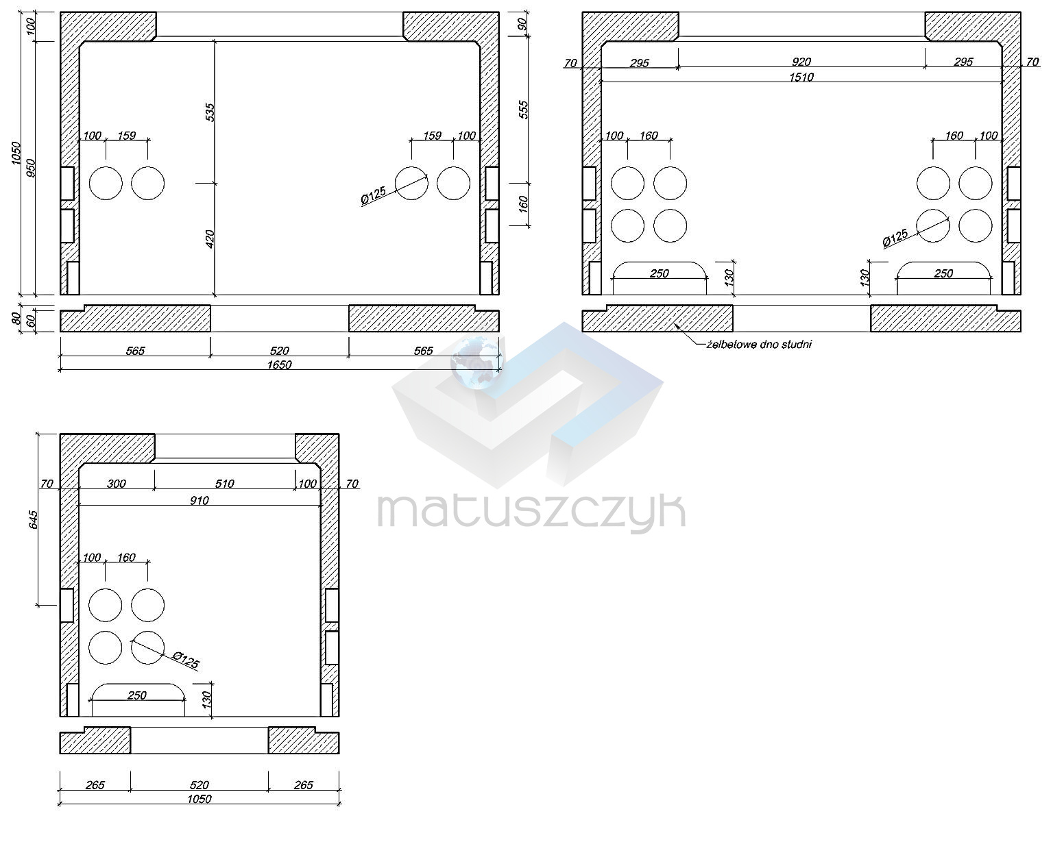Korpus studni jest 1-częściowy wykonany z betonu klasy co najmniej C30/37. Studnia wyposażona jest w zwieńczenie składające się z ramy lekkiej podwójnej lub ramy ciężkiej osadzonej w żelbetowym wieńcu oraz pokrywy lekkie z wietrznikiem lub bez lub pokrywy ciężkiej. W dnie studni jest możliwość instalacji dwóch osadników. Ciężar studni z płytą denną 2100 kg + 600 kg.